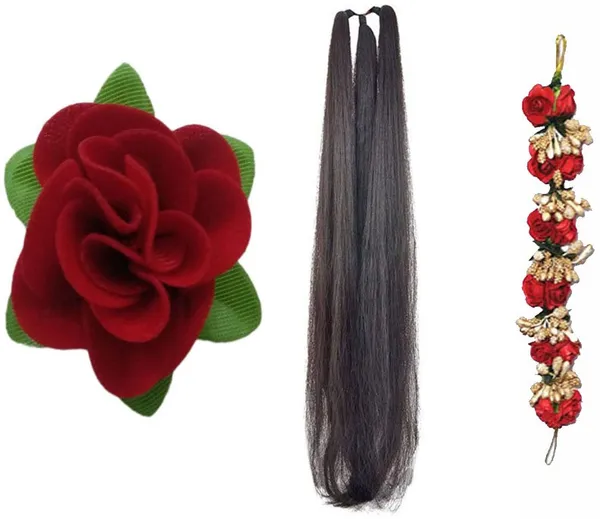 1PCS BLACK 24INCH PRANDI, 1PCS RED ROSE HAIR CLIP AND 1 RED HAIR GAJRA