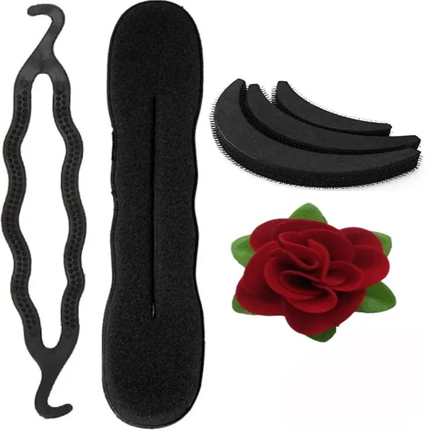 3 Bnana Puff Maker::1 Red Rose hair Clip::1 Magic Bun Maker::1 Medium Bun Maker